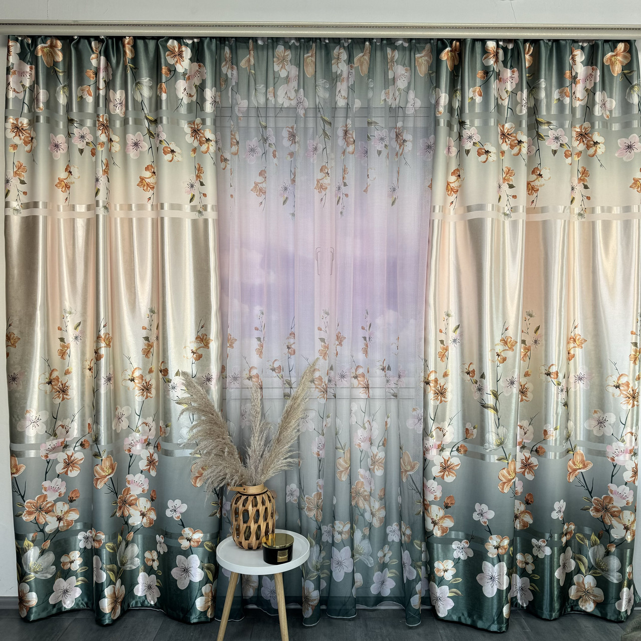 Атласні штори бірюзового кольору з батистовим тюлем з орхідеями, комплект 2 штори + тюль